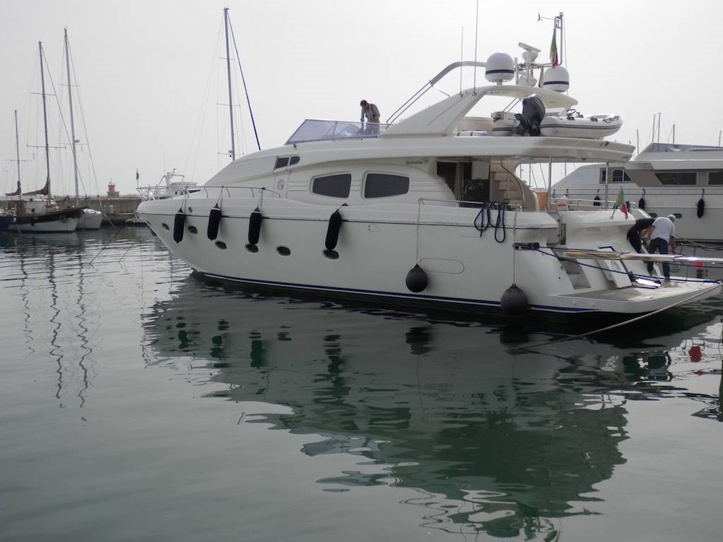 Boat in order currently ashore in shed. 2016: Extraordinary maintenance of MAN engines (heat exchangers, injectors, etc.). 2014: replacement of all internal and external upholstery (curtains, heads, sofas, cushions). Interior layout: Satin cherry interiors, parquet flooring in the saloon and dashboard, carpet in the cabins. Master cabin with double bed, walk-in closet, bathroom with separate shower - Vip cabin with double bed and bathroom - guest cabin with single bed and bathroom - guest cabin with two flat beds and bathroom. Crew accommodation in the bow for two with bathroom. Electronic: Flybridge: VHF Simrad - Pan Nav CX44 - Autopilot AP25 Simrad - Simrad IS 15. Dashboard: Simrad CX54 - Autopilot Simrad AP25 - Rudder angle Simrad - VHF Simrad RS32 - GPS Furuno GP32. Equipment: Bow and stern thruster Side Power - Seatel SAT antenna - retractable LCD TV in the saloon - bar cabinet with ice maker, sink and hotplate on flybridge - underwater lights under the aft platform - Miele dishwasher - Miele oven - Miele hob - Miele fridge freezer - Novamarine 4 m. tender with Yamaha 40 hp 4t outboard. (plus 5% agency fees)