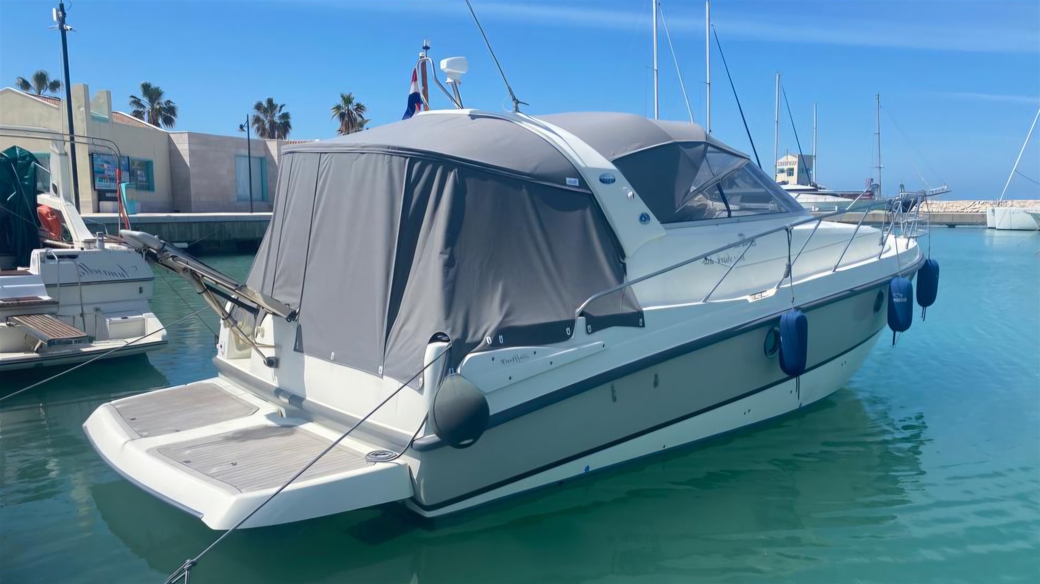 Imbarcazione in ordine, completa e pronta. Disposizione degli interni: Letto matrimoniale a prua - cabina ospiti con letto matrimoniale - bagno con doccia. Elettronici: GPS/plotter Raymarine Axiom 12" - ecoscandaglio Raymarine - pilota automatico Raymarine - VHF - tridata. Equipaggiamenti: Elica di prua - passerella idraulica - aria condizionata - gruppo elettrogeno Paguro 4 kW - mobile pozzetto con lavello e frigo - frigo interno - forno microonde - piano cottura due fuochi a gas - impianto stereo - cuscineria completa - bimini - telo copri pozzetto invernale e microforato - plancetta di poppa in teak. (più commissioni di agenzia 5%)