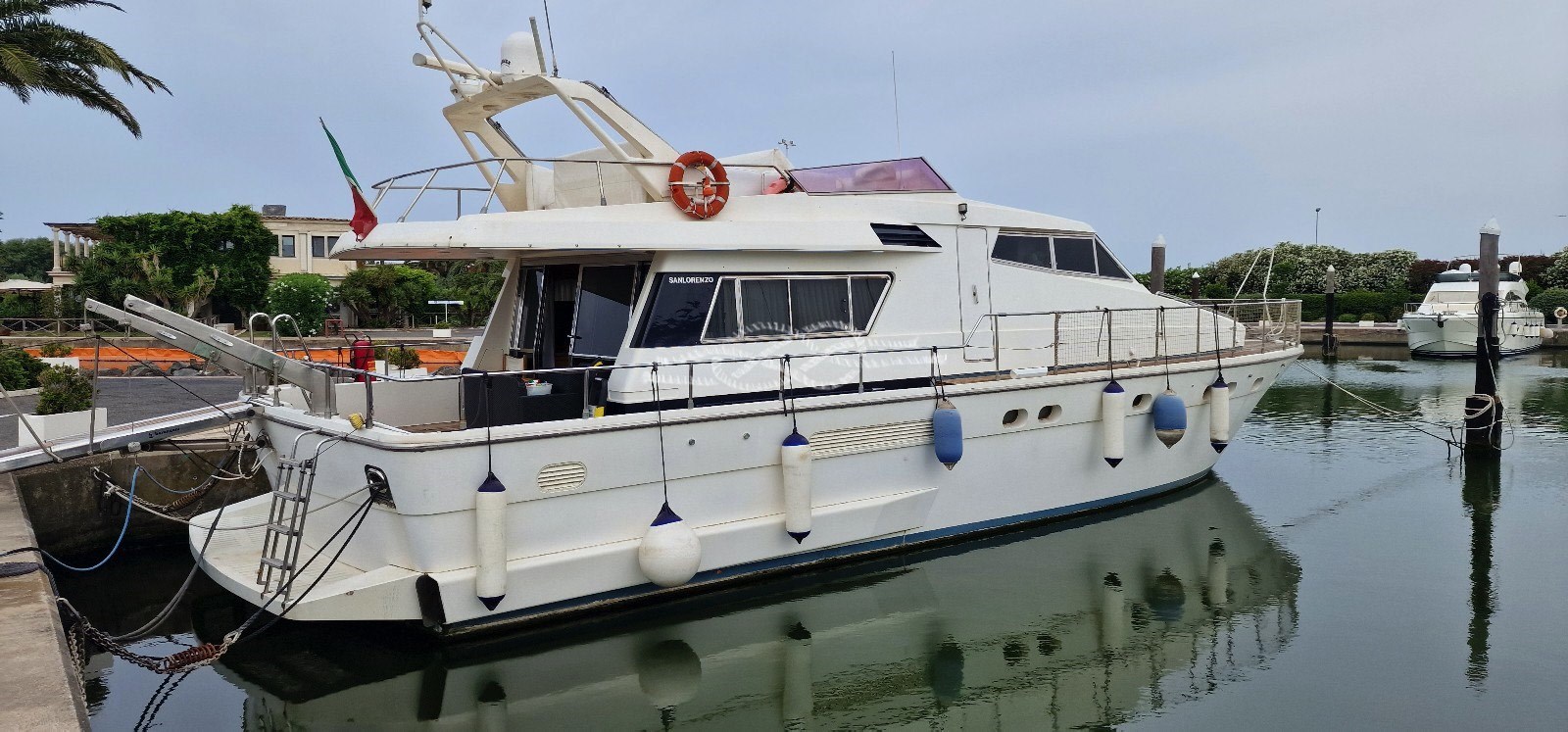 Imbarcazione in buone condizioni, unico proprietario fino al 2017, ora al secondo. Lavori 2022: revisione compressori volumetrici - registrazione valvole - taratura iniettori - sostituzione luci di cortesia cabine ospiti - tagliando motori e generatore. Lavori vari: gruppo Kohler (2017) - aria condizionata Condaria (2020) - ecoscandaglio e VHF Raymarine (2020) - GPS/Plotter Garmin (2017) - piano cottura induzione (2021) - batterie servizi e motori n. 17 x 195 Ah - rifacimento serbatoi gasolio (2015) - sostituzione pompa flap (2018) - sostituzione delle prese a mare (2018) - equilibratura eliche (2020). Disposizione degli interni: Cabina armatoriale con letto matrimoniale e bagno - cabina opsiti con due letti in piano e bagno - cabina opsiti con due letti in piano e bagno. Alloggio equipaggio a prua con due letti e bagno. Elettronici: GPS/Plotter Garmin (2010) - ecoscandaglio Raymarine (2020) - pilota automatico Robertson - radar Furuno - VHF Raymarine (2020). Equipaggiamenti: Elica di prua e di poppa elettriche - tenute assi PSS - gruppo elettrogeno Kohler 27 kW - aria condizionata Condaria (2020) - antenna TV Glomex - antenna TV SAT Glomex - TV LCD in salone - passerella Besenzoni - frigo freezer - piano cottura induzione 4 fuochi - ghiacciaia e ice maker in salone - frigo fly - lavastoviglie - stereo in ogni cabina - hi-fi in salone e fly - tender Arimar 2,60 m con fuoribordo Evinrude 3,5 hp - serbatoi acque grigie e nere. (più commissioni di agenzia 5%)